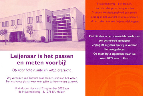 Leijenaar has now gone through two takeovers and has grown out of its seams again in the building on Botweg and is moving to Nijverheidsweg in Huizen.
