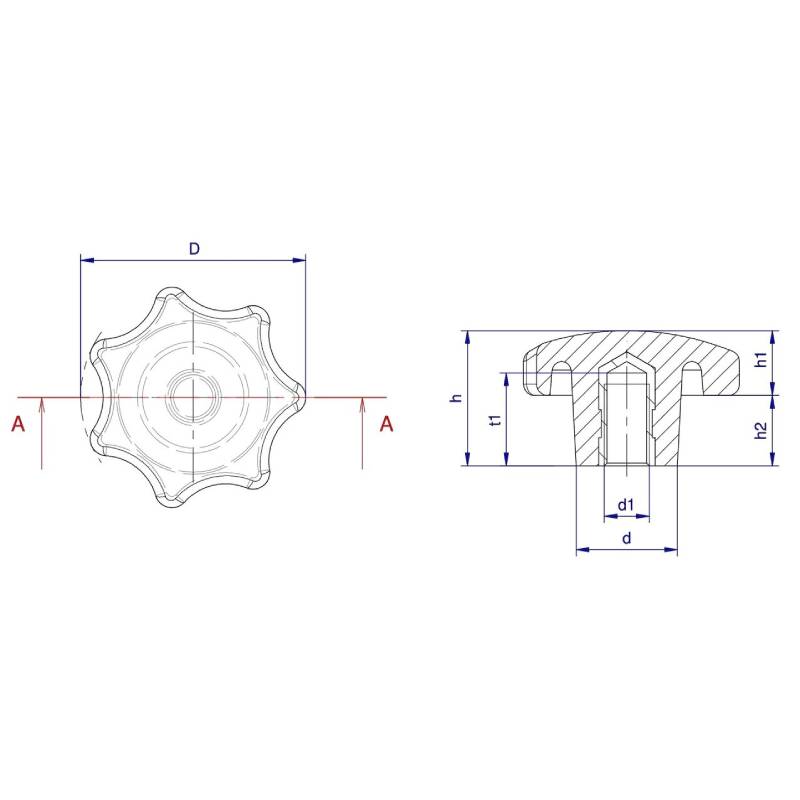 | Artikel | D [mm] | d1 | t1 [mm] | d [mm] | h [mm] | h1 [mm] | h2 [mm] | VE | Voorraad | Prijs | Bestel | ||