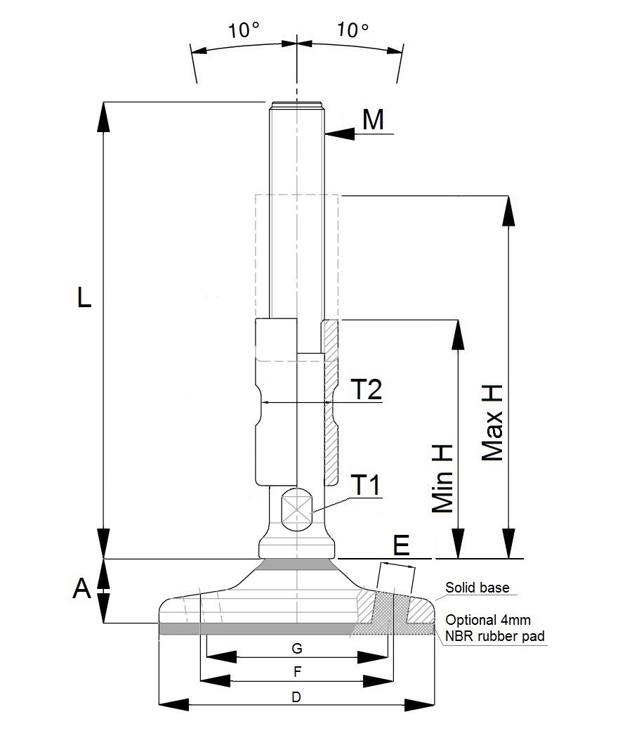 | Artikel | D [mm] | M | L [mm] | A [mm] | T1 [mm] | T2 [mm] | Min to Max (H) | G [mm] | E [mm] | Load (Newton) | Antisliplaag | VE | Voorraad | Prijs | Bestel | ||