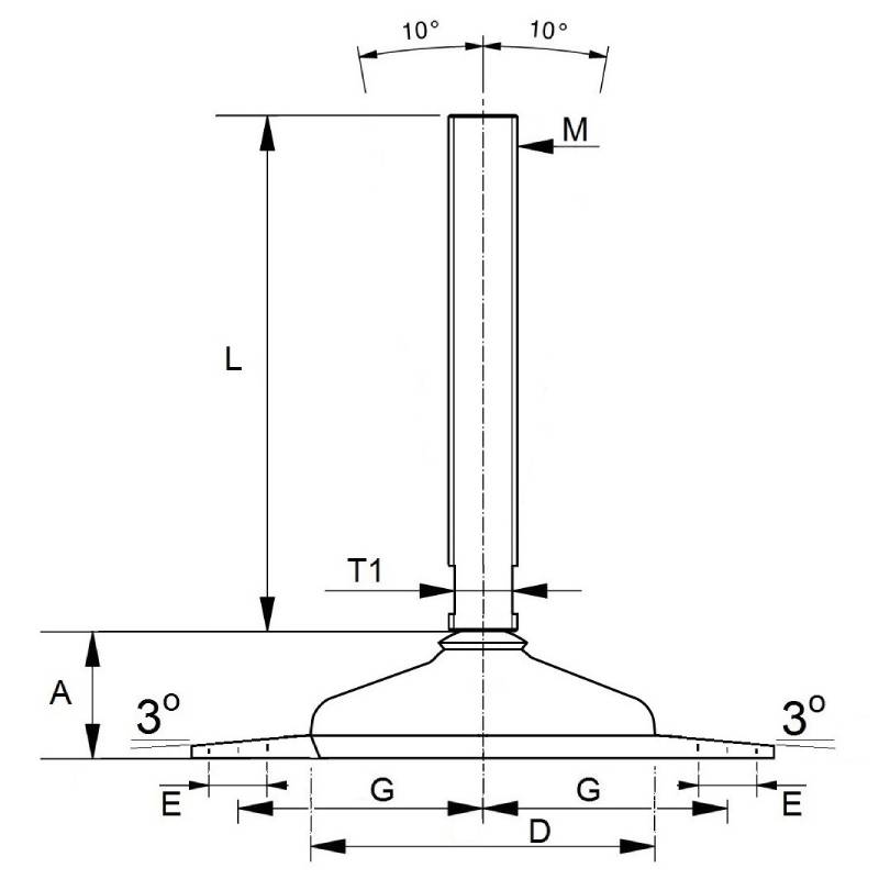 | Artikel | D [mm] | M | L [mm] | A [mm] | T1 [mm] | G [mm] | E [mm] | Load (Newton) | Antisliplaag | CAD | VE | Voorraad | Prijs | Bestel | ||