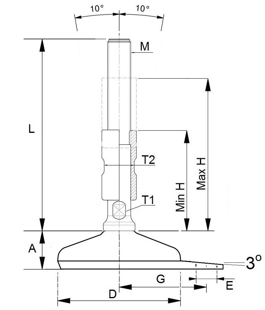 | Artikel | D [mm] | M | L [mm] | A [mm] | T1 [mm] | T2 [mm] | Min to Max (H) | G [mm] | E [mm] | Load (Newton) | Antisliplaag | CAD | VE | Voorraad | Prijs | Bestel | ||