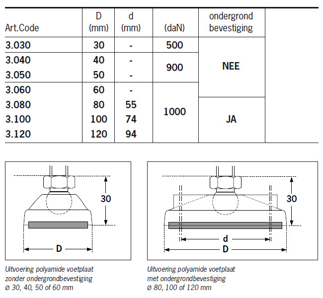 | Artikel | D [mm] | Draagkracht [kg] | Ondergrondbevestiging | d [mm] | VE | Voorraad | Prijs | Bestel | ||
