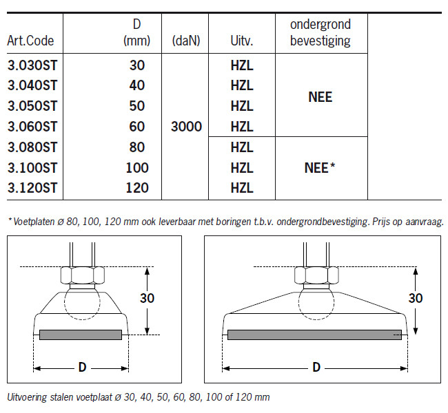 | Artikel | D [mm] | Ondergrondbevestiging | Draagkracht [kg] | VE | Voorraad | Prijs | Bestel | ||