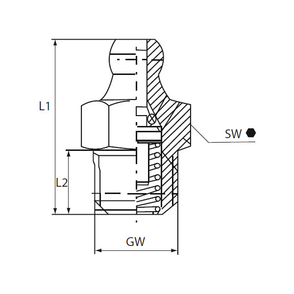 Smeernippel type HR met stiftventiel. Het speciale stiftventiel zorgt ervoor dat de opening na het smeren hermetisch wordt afgesloten. Hierdoor kan, afhankelijk van de toepassing, een pulsvormige interne druk tot 400 bar worden gehandhaafd. Dit maakt de smeernippel bijzonder geschikt voor gebruik in de zware industrie en bij zware voertuigen.