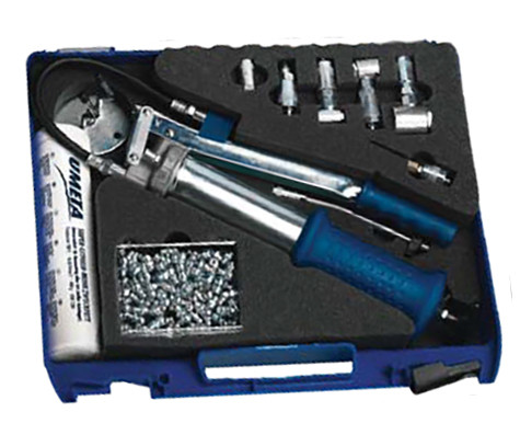 Een handige koffer met de schaarvetspuit 75/PKU met de volgende accessoires: